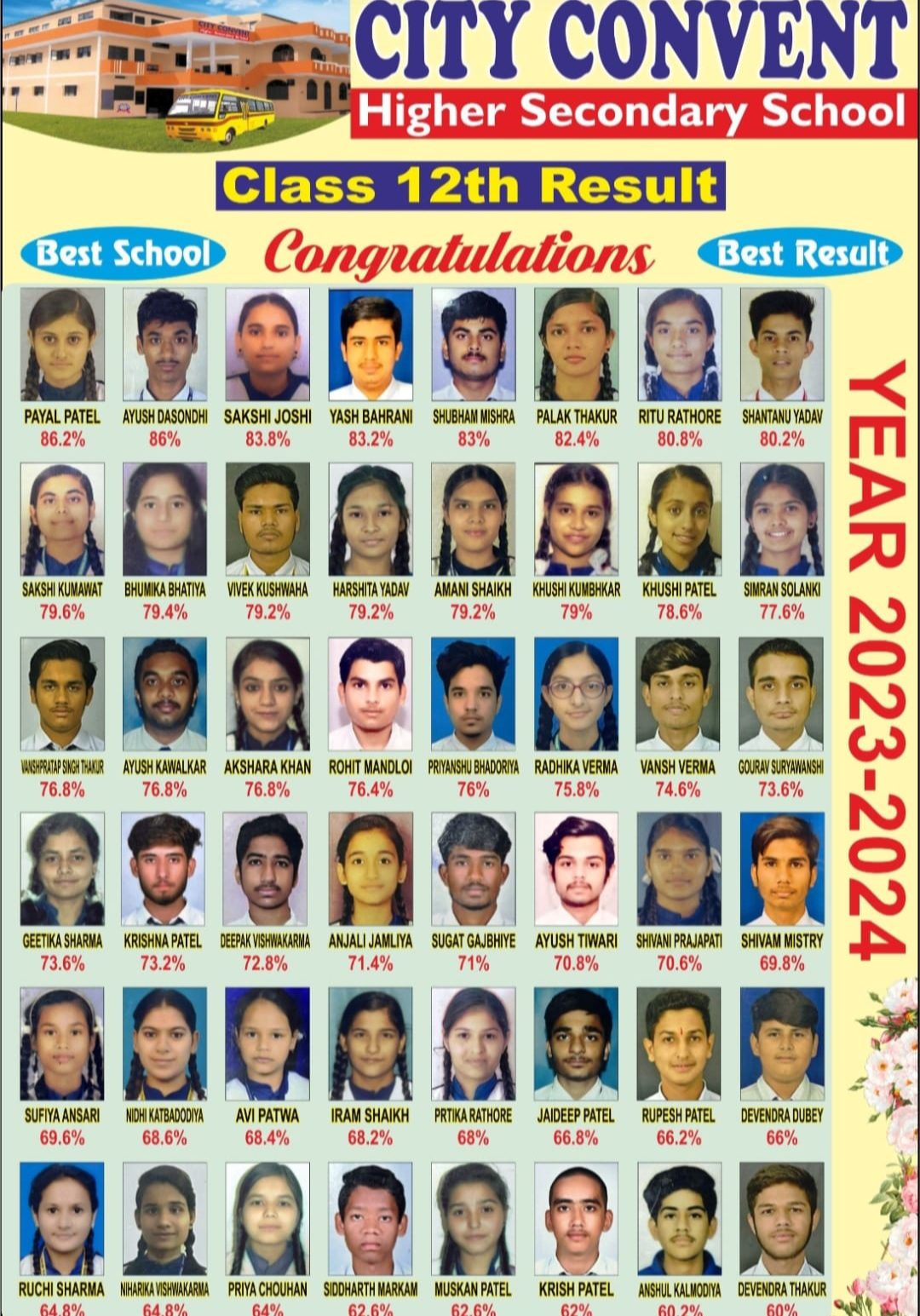 देवास। कक्षा 10वीं और 12वीं के बोर्ड परीक्षा में सिटी कॉन्वेंट स्कूल के छात्रों ने उत्कृष्ट प्रदर्शन किया । स्कूल के छात्रों ने शानदार प्रदर्शन किया। कक्षा 10वीं में पहले स्थान पर श्रुष्टि विश्पुटे ने 91.8 प्रतिशत मार्क्स प्राप्त किए। दूसरे स्थान पर मोहम्मद शान अली ने 91.4 प्रतिशत और तीसरे स्थान पर निधि कुमावत ने 87.8 प्रतिशत मार्क्स हासिल किए।कक्षा 12वीं में पहले स्थान पर पायल पटेल ने 86.2 प्रतिशत, दूसरे स्थान पर आयुष डसोंधी ने 86 प्रतिशत और तीसरे स्थान पर साक्षी जोशी ने 83.8 प्रतिशत मार्क्स प्राप्त किए। स्कूल के प्रिंसिपल ने उत्कृष्ट प्रदर्शन करने पर छात्रों की प्रशंसा कर बधाई दी। छात्रों की सफलता में स्कूल के शिक्षकों का महत्वपूर्ण योगदान रहा। सिटी कानवेंट स्कूल के छात्रों के लिए यह एक गर्व का पल है।
