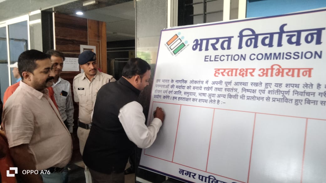 INFORM HUMAN देवास। विधानसभा 2023 के अन्तर्गत होने वाले निर्वाचन मे नागरिको की अधिक से अधिक भागीदारी हो इसी उद्देश्य से को दृष्टिगत रखते हुए स्वीप गतिविधि अन्तर्गत नगर निगम कार्यालय के गेट पर हस्ताक्षर अभियान का मतदाता जागरूकता बोर्ड लगाया गया। जिस पर 18 अक्टुबर बुधवार को आयुक्त रजनीश कसेरा के द्वारा निगम उपायुक्त वित्त पुनित शुक्ला, उपायुक्त देवबाला पिपलोनिया के हस्ताक्षर कर हस्ताक्षर अभियान का शुभारंभ किया गया। इस अवसर पर आयुक्त ने कहा की होने वाले विधानसभा निर्वाचन मे मतदाताओं को निर्भिक होकर अधिक से अधिक अपने मताधिकार का उपयोग करने हेतु जागरूकता अभियान निगम द्वारा निरंतर चलाया जा रहा है। ” हम भारत के नागरिक, लोकतंत्र मे अपनी पूर्ण आस्था रखते हुए यह शपथ लेते हैं कि हम अपने देश की लोकतांत्रिक परम्पराओं की मर्यादा को बनाये रखेगें तथा स्वतंत्र निष्पक्ष एवं शांतिपूर्ण निर्वाचन की गरिमा को अक्षुण्ण रखते हुए, निर्भिक होकर, धर्म, वर्ग, जाति, समुदाय, भाषा अथवा अन्य किसी भी प्रलोभन से प्रभावित हुए बिना सभी निर्वाचन मे अपने मताधिकार का प्रयोग करेगें” के शपथ बोर्ड पर हस्ताक्षर किये गये। इस अवसर पर निगम सहायक यंत्री इंदुभारती, उपयंत्री दिनेश चौहान, दिलीप मालवीया, राघवेन्द्र सेन, उमेश चतुर्वेदी, भोलासिह जादोन, मुन्ना कुरैशी, हेमराज सांगते, अजीमुद्दीन शेख, विशाल जगताप, मनीष मण्डलोई, सुनिल जोशी, हिम्मत शिन्दे, नारायण श्रीवास, आनंद दुबे, मुजफ्फर अली, कमला बांगर, कला सुर्यवंशी, अफ्शा शेख, आदि सहित निगम कर्मचारियो ने भी उपस्थित होकर हस्ताक्षर अभियान मे भाग लिया।