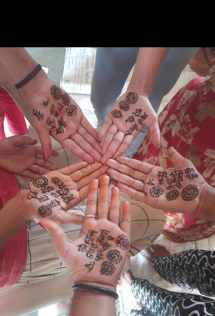 देवास। जिले में लोकसभा निर्वाचन-2024 में शतप्रतिशत मतदान के लिए कलेक्टर एवं जिला निर्वाचन अधिकारी ऋषव गुप्ता तथा सीईओ जिला पंचायत एवं नोडल स्वीप अभियान हिमांशु प्रजापति के मार्गदर्शन में “चलें बूथ की ओर” अभियान एवं मतदाता जागरूकता अभियान गतिविधियां संचालित की जा रही है। लोकसभा निर्वाचन 2024 के अंतर्गत स्वीप अभियान की गतिविधियों के तहत “चलें बूथ की ओर” अभियान में जिले में मतदाताओं को मतदान के लिए प्रेरित किया जा रहा है। अभियान के तहत आंगनवाड़ी कार्यकर्ताओं, महिलाओं एवं युवतियों द्वारा मतदाताओं को जागरूक करने के लिए हाथों में मेहंदी लगाई तथा हाथों में मेहंदी लगाकर मतदाताओं को दिनांक 13 मई को मतदान करने के लिए जागरूक कर रही हैं। हाथों में मतदाता जागरूकता संबंधी नारे खिलकर कह रही है कि “सारे काम छोड़ दो-सबसे पहले वोट दो”। “ लोकतंत्र का पर्व मनाए-वोट डालने अवश्य जाएं”। इस प्रकार के संदेश भी लिख रही है। उल्लेखनीय है कि जिले में चलें बूथ की ओर” अभियान एवं स्वीप अभियान के तहत की जा रही गतिविधियों में सभी के द्वारा उत्साह से सहभागिता की जा रही है तथा इस कार्य में मतदाताओं के द्वारा भी विशेष रूचि ली जा रही है। साथ ही सभी लोग आपस में जागृत हो रही रहे हैं, और अन्य लोगों को भी जागरूक कर रहे हैं।