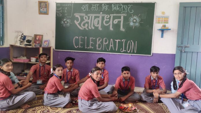 INFORM HUMAN | देवास। शासकीय माध्यमिक विद्यालय बिजेपुर में छात्र-छात्राओं द्वारा रक्षाबंधन धूमधाम से बनाया गया। विद्यालय की बाल कैबिनेट के सदस्यों द्वारा आयोजन की पूरी तैयारी की गई एवं इस आयोजन का संचालन भी बाल कैबिनेट सदस्य द्वारा किया। विद्यालय के प्रधानाध्यापक श्री किशोर कनासे द्वारा विद्यार्थियों को रक्षाबंधन के महत्व को समझाया गया। इस उत्सव की विशेषता यह रही कि राखियाँ छात्राओं द्वारा स्वयं अपने हाथों से बनायी गयी थीं। राखियाँ बहुत ही सुंदर व आकर्षक थी।। राखियाँ बहुत ही अच्छे सृजनात्मक रूप से बनाई गई, सभी छात्र-छात्राओं को इस सुंदर पहल के लिए विद्यालय के शिक्षक नितिन गुप्ता एवं शिक्षिका आशा तिलोदिया द्वारा शुभकामनाएं दी एवं बाल कैबिनेट के प्रधानमंत्री कु. विनीता लुवानिया द्वारा आभार व्यक्त किया।