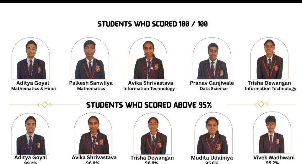 संस्थान की ओर से जारी प्रेस विज्ञप्ति के मुताबिक आदित्य गोयल ने 99.2% अंक प्राप्त कर शीर्ष स्थान हासिल किया। पाँच छात्रों ने विभिन्न विषयों में 100/100 अंक प्राप्त कर शानदार प्रदर्शन किया। आदित्य गोयल ने गणित और हिंदी में पूर्णांक प्राप्त किए, जबकि त्रिशा देवांगन और अविका श्रीवास्तव ने सूचना प्रौद्योगिकी में, पलकेश सांवलिया ने गणित में तथा प्रणव गंजिवाले ने डेटा साइंस में 100 में 100 अंक हासिल किए।