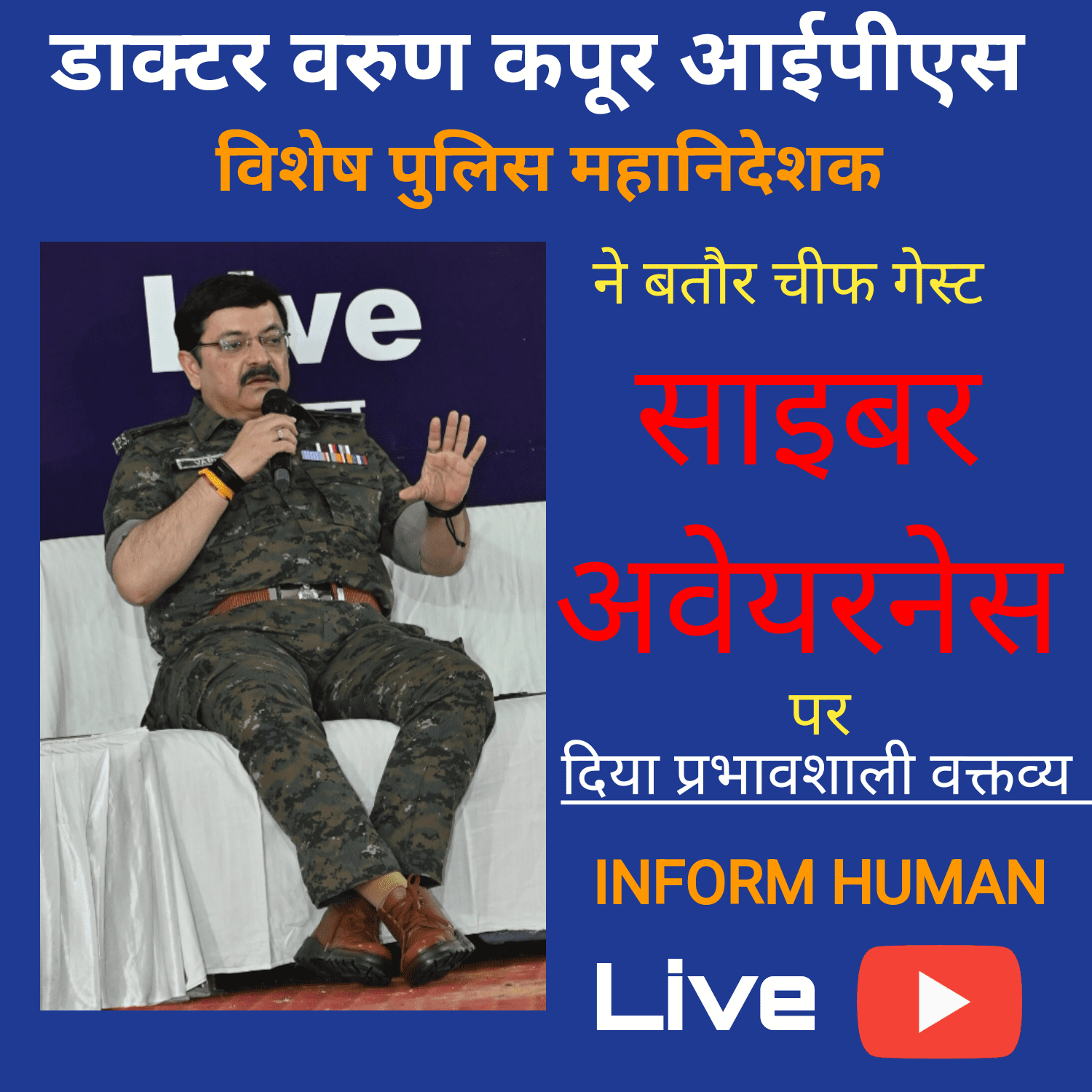 INFORM HUMAN। INFORM HUMAN द्वारा साइबर अवेयरनेस समारोह (लाइव) का आयोजन 17 अप्रैल को होटल सृष्टि क्लब देवास में आयोजित किया गया। समारोह में बतौर चीफ गेस्ट पधारे डाक्टर वरुण कपूर आईपीएस विशेष पुलिस महानिदेशक ने साइबर अवेयरनेस पर प्रभावी वक्तव्य दिया। इस दौरान उन्होंने करीब एक घंटे लगातार साइबर पर संबोधन दिया। इससे पहले आईएच एडिटर राजेश व्यास ने डाक्टर कपूर से लाइव संवाद किया, इसके बाद डाक्टर कपूर ने जनता से सीधे संवाद किया। बता दें कि डाक्टर कपूर एक वरिष्ठ आईपीएस अधिकारी हैं जो मध्य प्रदेश कैडर से जुड़े हैं। आप 1991 में भारतीय पुलिस सेवा में शामिल हुए और वर्तमान में रुस्तमजी सशस्त्र पुलिस प्रशिक्षण महाविद्यालय, इंदौर के एडीजीपी के रूप में कार्यरत हैं। आपने एनआईटी त्रिची से बीई (ऑनर्स) मैकेनिकल इंजीनियरिंग की डिग्री हासिल की है। आप मध्य प्रदेश कैडर से संबंधित पुलिस रेडियो ट्रेनिंग स्कूल, इंदौर के आईजीपी और नार्कोटिक्स के एडीजीपी भी रह चुके हैं। आपने ओरिएंटल यूनिवर्सिटी से साइबर सुरक्षा में मानद उपाधि प्राप्त की। आप एशिया के पहले पुलिस अधिकारी हैं जिन्हें इस मानद उपाधि से सम्मानित किया गया है। आपने वन्यजीव संरक्षण और साइबर तकनीक के उपयोग पर प्रशिक्षण कार्यशालाओं का आयोजन किया। आप नारकोटिक्स, यातायात, महिला सुरक्षा, वन्यजीव संरक्षण, और अपराध जांच के क्षेत्र में भी विशेषज्ञता रखते हैं। आप कई राज्य, राष्ट्रीय और अंतर्राष्ट्रीय पुरस्कारों से सम्मानित किए गए हैं। डाक्टर कपूर के प्रभावशाली वक्तव्य को आप INFORM HUMAN के यु ट्यूब चैनल पर देख सकते हैं।